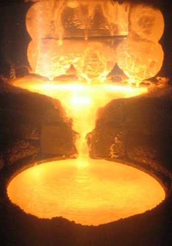 production of structurally and chemically homogeneous titanium ingots of both round and rectangular cross-section from initial charge in one remelting cycle.
